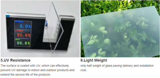 2) Light weight: | About 1/2 times of glass of the same thickness. |
